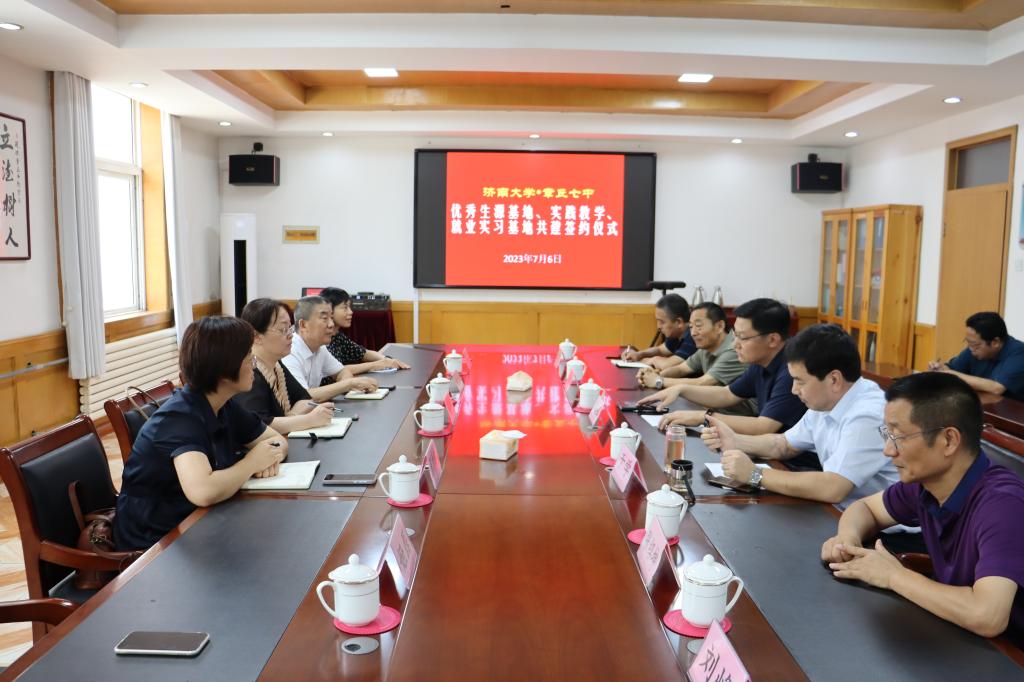 会上,济南大学与章丘第七中学签订了优秀生源基地、实践教学基地、就业实习基地协议,并举行了授牌仪式。